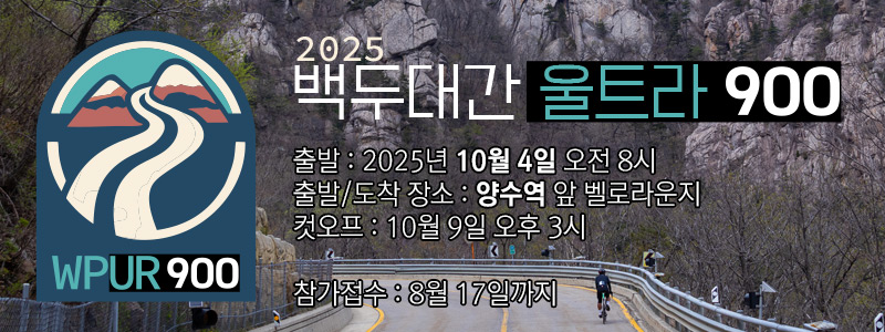 WP(White Peaks) Road is paved road including South-Hangang and Baedudaegan(백두대간, 白頭大幹) mountain range, North-Hangang. The route is about 920km long with 17000m elevation gain. WPUR 900 is also a self-supported race, so the riders must take care of themselves to find the route and what to eat, where to sleep. We hope every participant will complete the ride safely. |