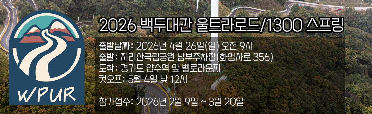 2025 주요 기록※ 가장 빠른 완주 : 67.조형규 - 107시간 36분 ※ 가장 빠른 여자 완주 : 13.이의정 - 153시간 46분 ※ 최고령 완주 : 52.김정현 - 57세 ※ 최연소 완주 : 37.김봉민 - 30세 ※ 첫 MTB 완주 : 68.정구운 ※ 첫 미니벨로 완주 : 50.주정환 ※ 첫 전기자전거 완주 : 16.박주영 - 전체 접수자 : 25명 WPUR 전체 기록※ 가장 빠른 완주 : ※ 첫 여자 완주 : ※ 최고령 완주 : ※ 최연소 완주 : 37.김봉민 - 29세 (2024년) - 전체 출발 인원 : 36명 |